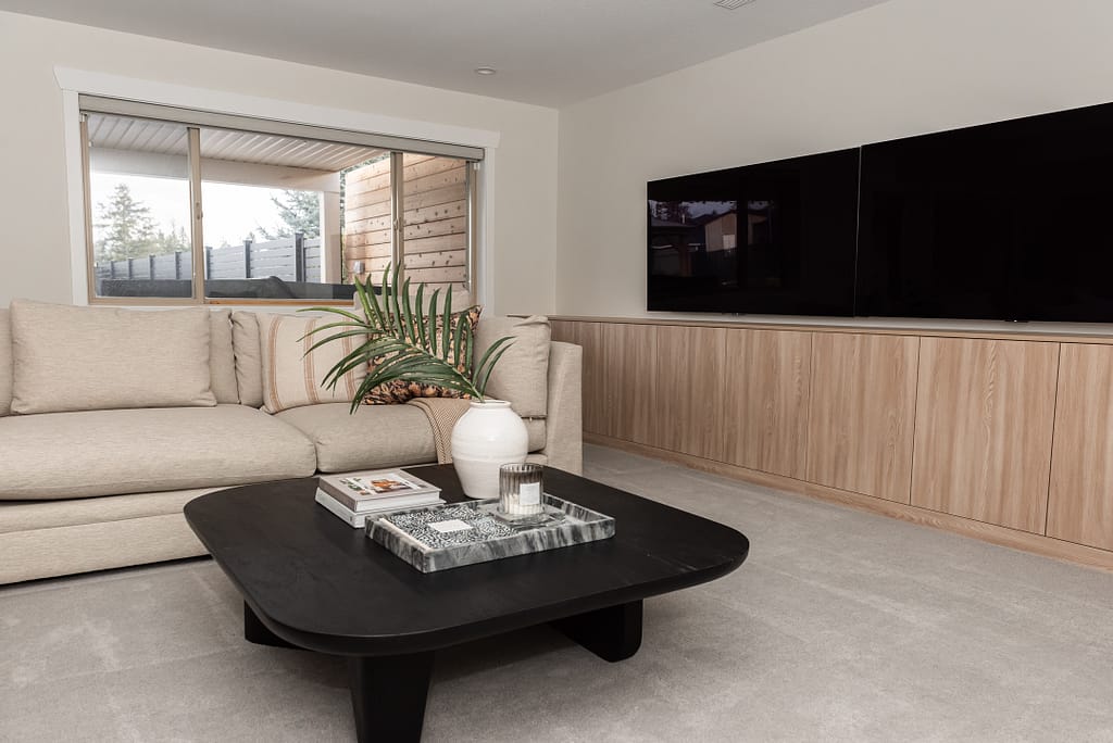 Performance, but make it pretty. A deep sectional invites lounging, while the low-profile built-in keeps consoles and clutter out of sight. Pro tip: custom millwork can double as both storage and a visual anchor.