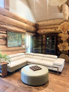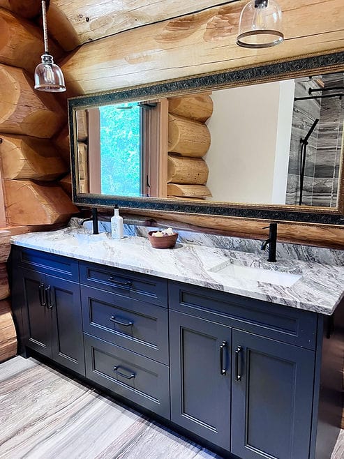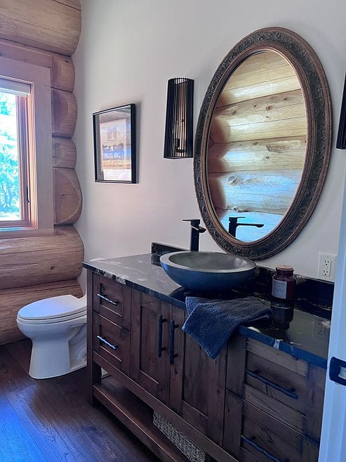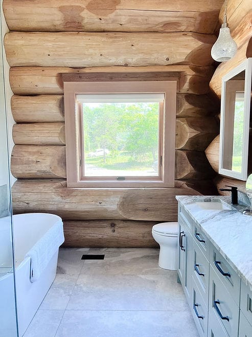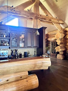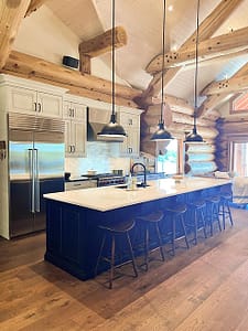 If you’ve got a log home in your future, whether a vacation home or your primary dwelling, my best tip for you would be to look for opportunities to create contrast. A log home is a lot of one material. These guys did a clever job creating much needed contrast in the following applications: