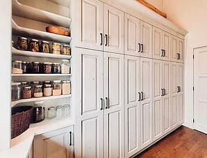 The pantry, also designed by Brooklace Kitchens, uses the same cabinetry as the bank of wall cabinets in the kitchen.