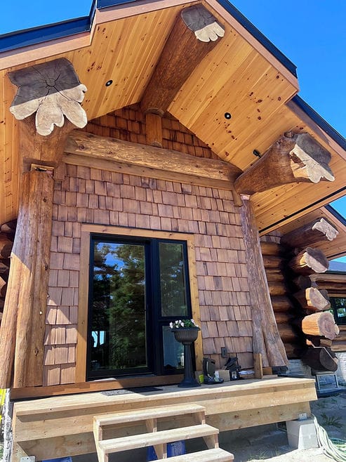 So first things first, apparently not all log homes are created equal! Our friends interviewed several builders and had it narrowed down to a couple of companies in British Columbia, but the winning bidder was Lake Country Log Homes who were able to do the beautiful flared detail on the king beams running through the home to the outside, as pictured.