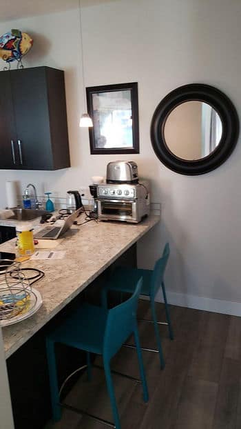 It was a squeeze to fit in full sized appliances in this teeny kitchen footprint, but we managed it, and the island offers a nice amount of counter space and an unencumbered view of the lake. When you’re in the space now, it’s pretty easy to forget you’re in a basement.