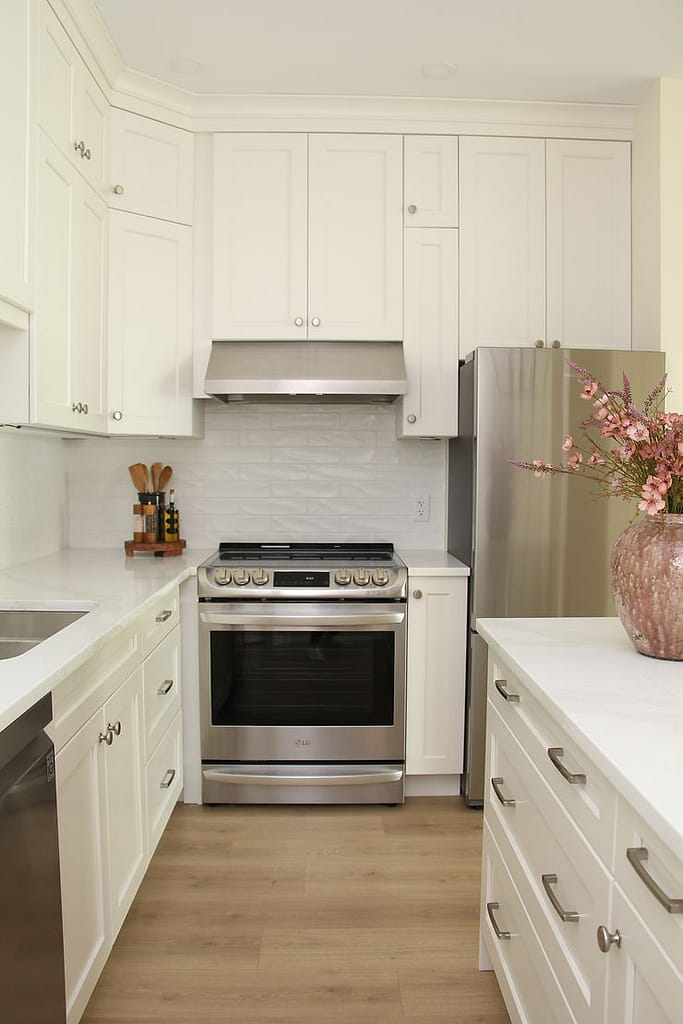 In an effort to maximize storage and help the space feel larger, we brought the cabinetry to the 9′ ceiling. A warm white shaker style was more to the clients taste and helped the space brighten up and take on a more timeless aesthetic. Calcutta Gold quartz countertops and subway tile with a subtle texture helped to complete the space.