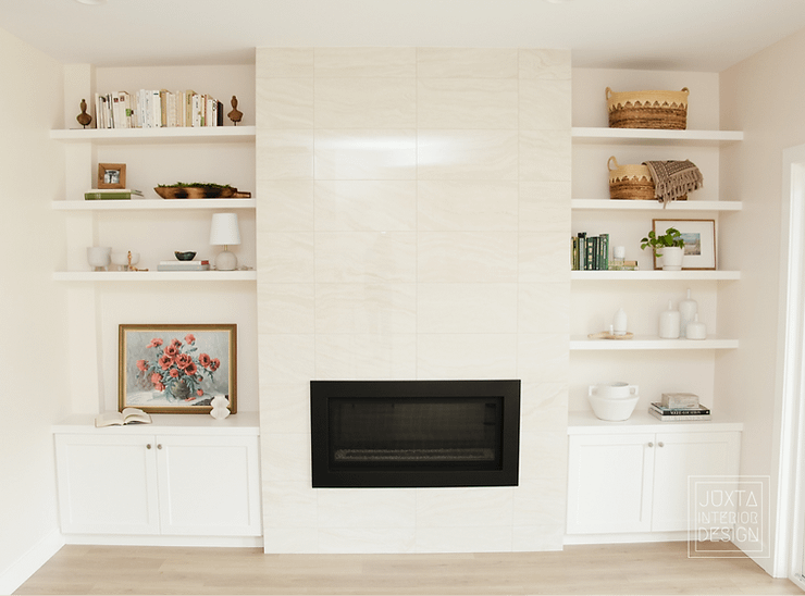 We also updated the tile on the fireplace and added built ins. A mix of open and closed storage is perfect in a living space, to be able to shut the door on items you don’t want seen, as well as an opportunity to add decor on the open shelves. The TV is now installed where the large art sits in this photo.