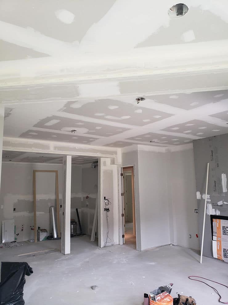 Taupe grey floors and walls, awkward partial wall, dark cabinets that didn’t make good use of the space.
