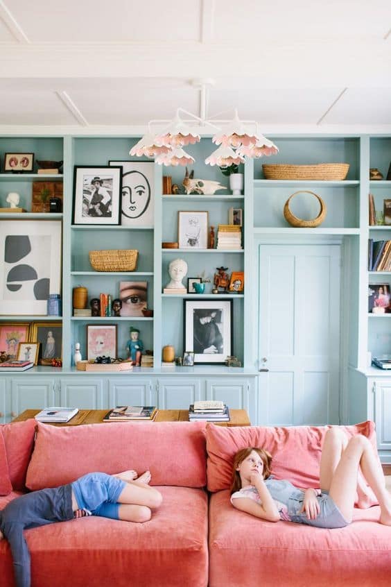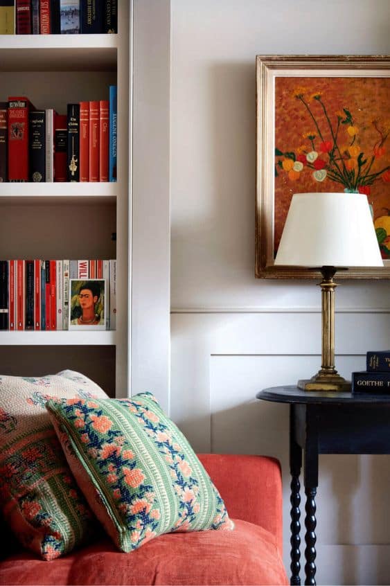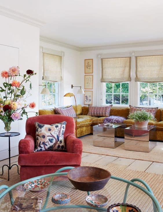 An often overlooked aspect of décor is texture. Textures can add depth and interest to a colourful space and can help balance out the intensity of the colours. Consider adding different textures like woven throws, textured pillows or shaggy rugs to add visual interest and create a more comfortable and inviting space. This mohair sofa in a rust terracotta colour is such a statement piece. Don’t be nervous to go colourful on your sofa, your favourite colour fabric on your sofa is much more timeless than the neutral of the moment.