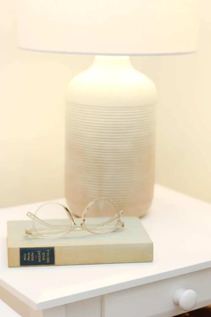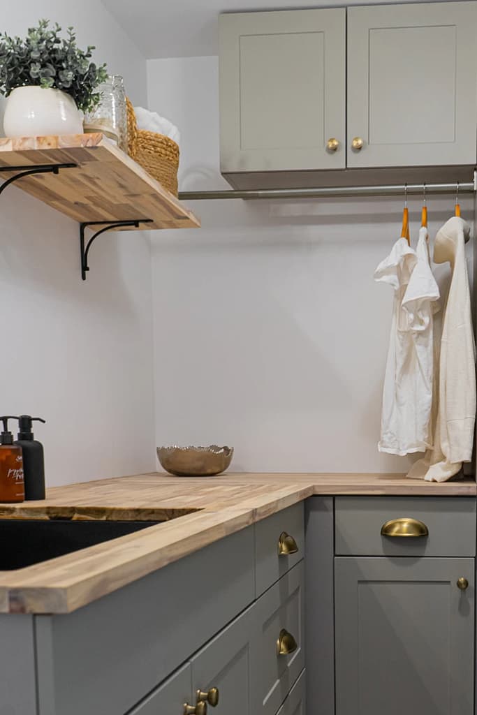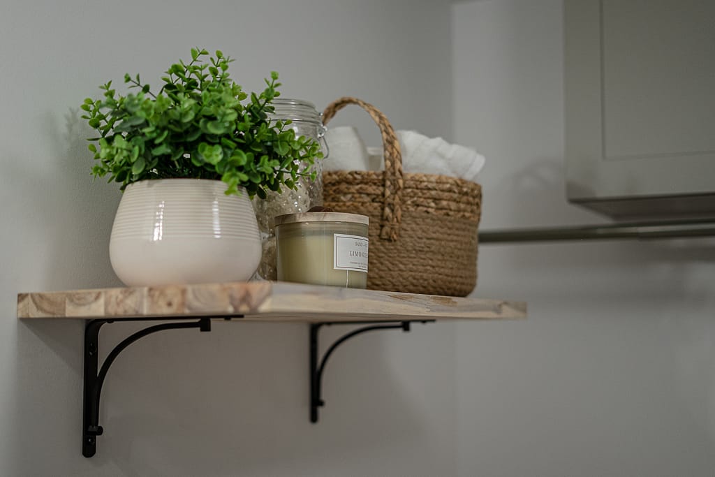 This space would look pretty flat if it weren’t for that cute little shelf that gives an opportunity for a stylish moment. This room has no windows, so we needed to bring some greenery indoors with a little faux plant, and added a pretty woven basket with soft towels, a glass canister for displaying/storing wool dryer balls (hello beauty and function all in one), and a candle because it’s a scientific fact that lighting a candle makes a chore sooooo much less chorey.